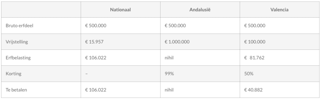 De regio waarin je tweede verblijf zich bevindt Verschillende regio’s hebben bijkomende vrijstellingen ingevoerd. De hoogte van deze vrijstelling is afhankelijk van de regio. Zo bedraagt de vrijstelling in Andalusië 99% voor erfgenamen in de rechte lijn, terwijl dit in de regio Alicante € 100.000 is.